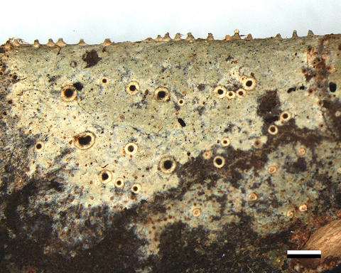 Apothecia on foliicolous thallus on the leaf surface and pycnidia on the leaf margin. Scale = 2 mm.
